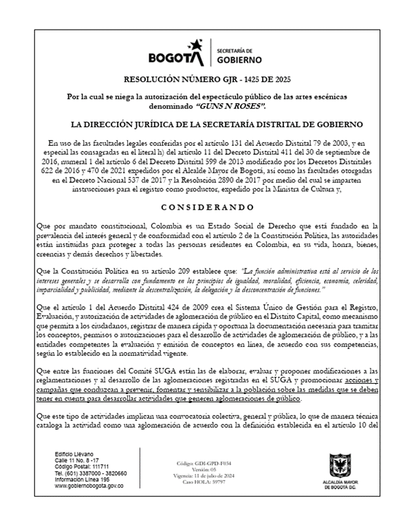 Según lo compartido por el medio, la secretaria Distrital de Gobierno no ha dado luz verde con el evento al no cumplir con algunos permisos. De acuerdo con la resolución 1425 del 29 de septiembre la ausencia de avales de seguridad y emergencias exigidos por entidades como el Idiger, Bomberos, Movilidad y la Policía Metropolitana, son causal suficiente para no otorgar el permiso para la realización del evento. Aunque no se ha emitido un comunicado oficial al respecto, la falta de confirmaciones ha alimentado los rumores entre los seguidores de la banda.